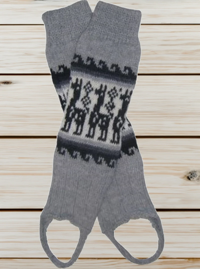 New handmade gaiters by skilful Bolivian artisans. Soft and warm, they helps to avoid cramps in the calves. They have a cute llamas design that gives them a unique look.Material: Wool Blend