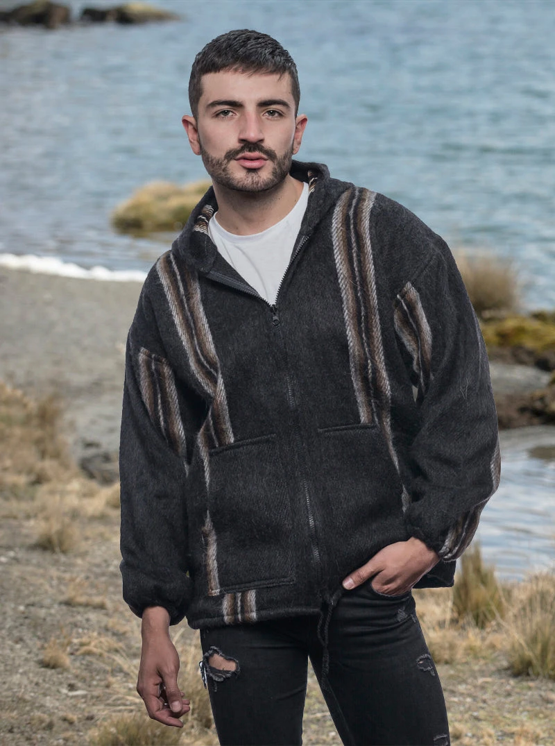 Alpaca wool jacket with hood and central pocket. White, grey and brown vertical stripes. This garment has a youthful casual and versatile design, perfect for any outdoor activity during cold winter seasons.