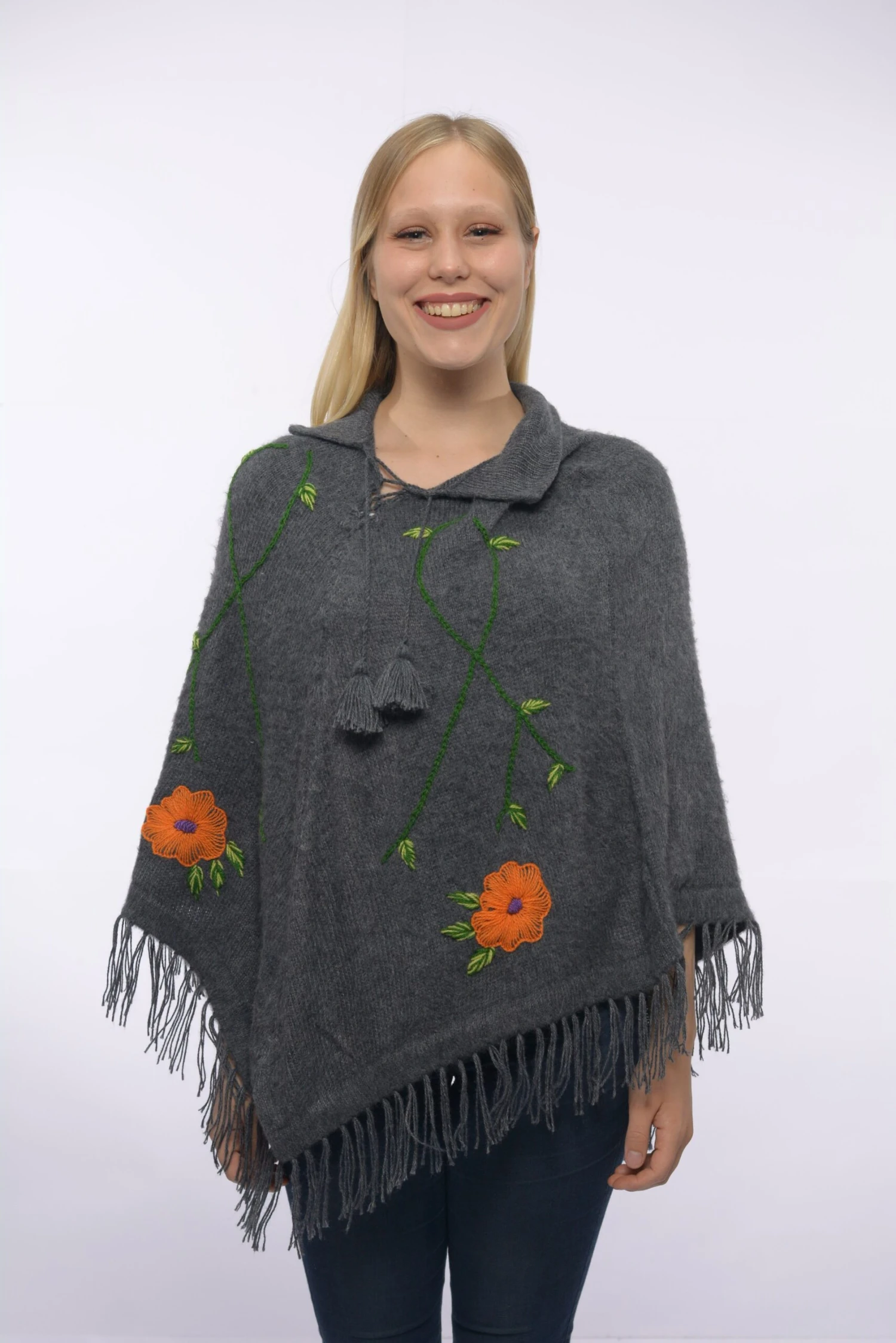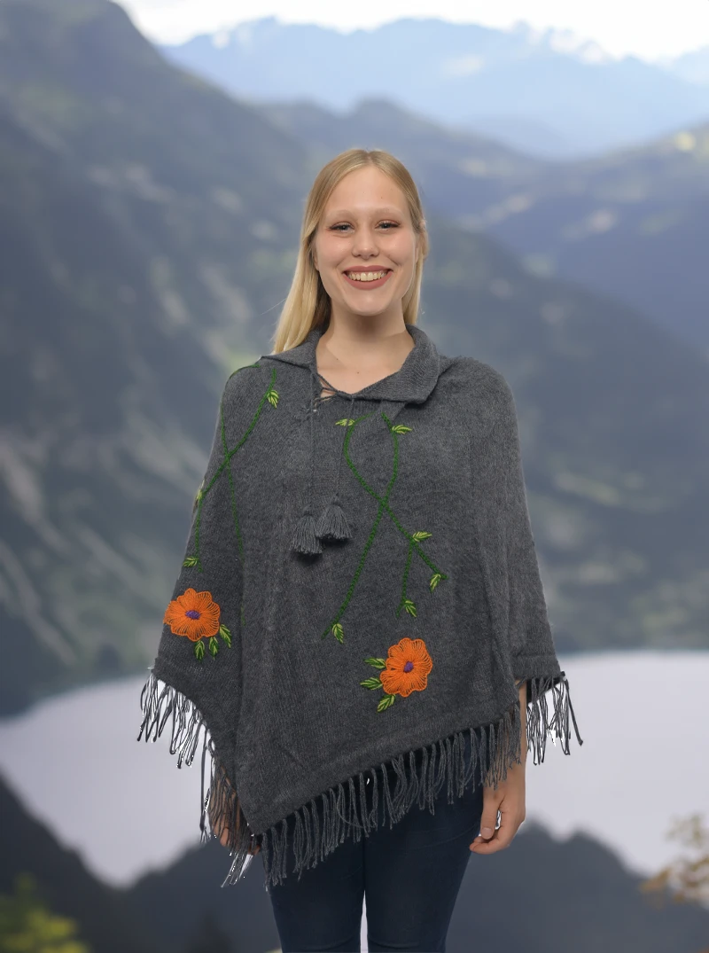 Beautiful Poncho handmade by Bolivian artisans. It displays a classic design with fringes and flowers figures as main decoration.Material: 100% alpaca wool