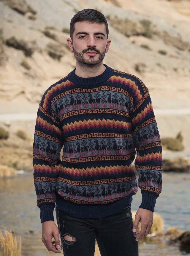 Note: Since this product is handmade, it may present slight variations from the pictures. Description: Round neck sweater with horizontal stripes and a geometrical colorful pattern