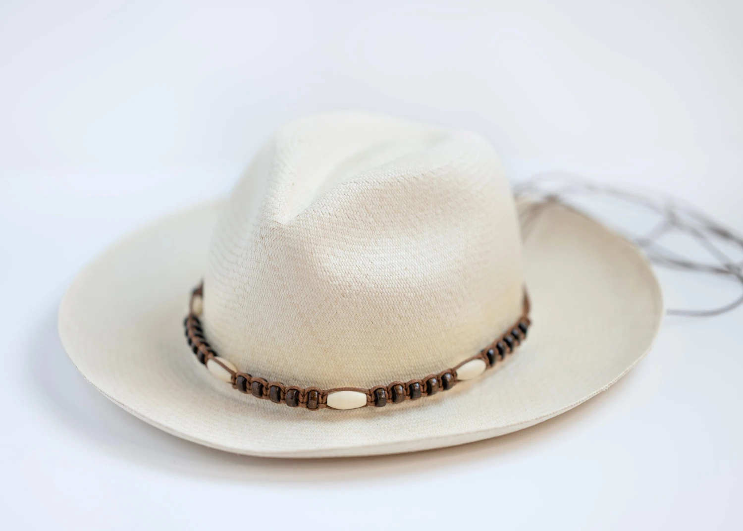 The beaded pattern adds natural texture, while the flexible leather ties allow for an easy, customizable fit on a variety of hat styles.