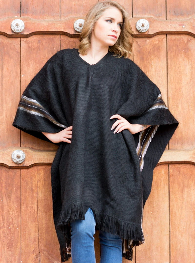 Amazing poncho entirely hand knitted by Bolivian artisans. This native garment shows stripes on the sides as main decoration. A premium quality poncho, very warm, comfortable and very soft.Material: Wool Blend
