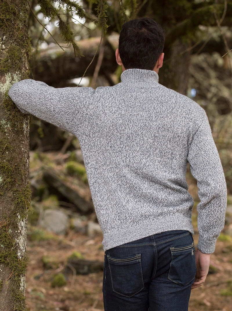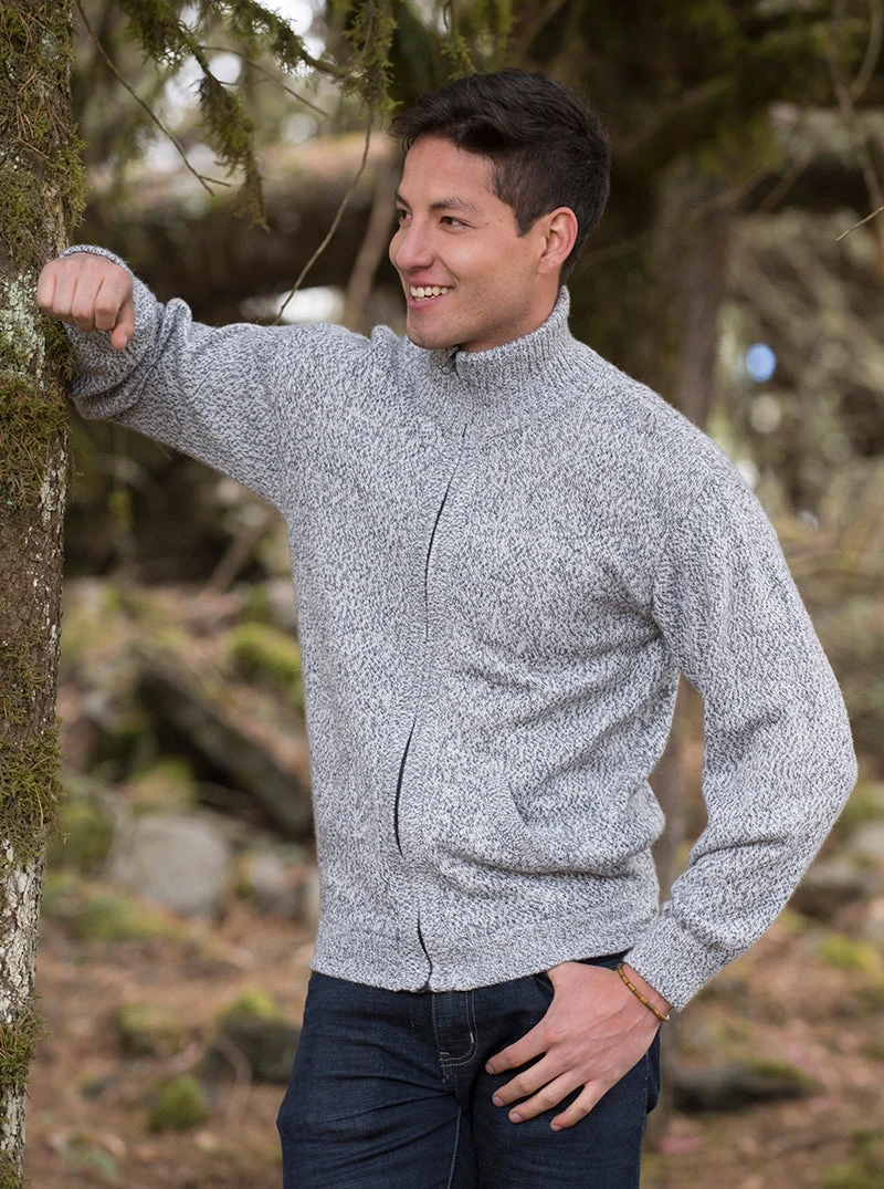Gray cardigan made by Bolivian artisans with turtleneck and zipper. It has a youthful and modern design. This garment is versatile and casual, perfect for winter seasons.