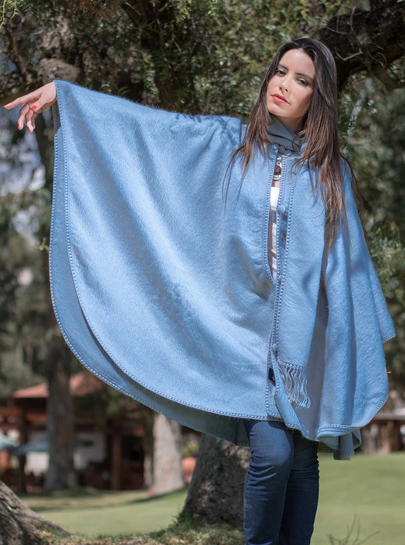 Description: Soft and elegant alpaca cape, very warm and comfortable. It also has a scarf with fringes and button in the front that add an elegant and feminine style.