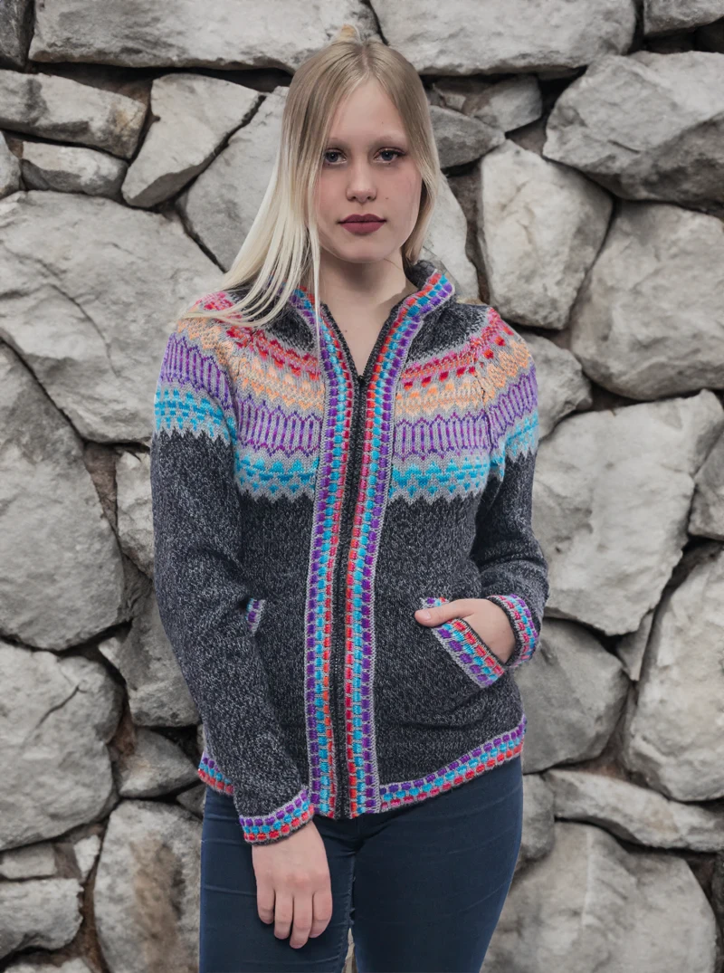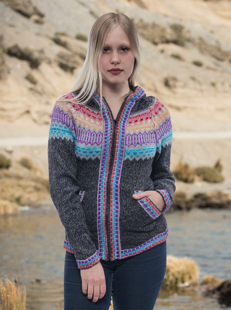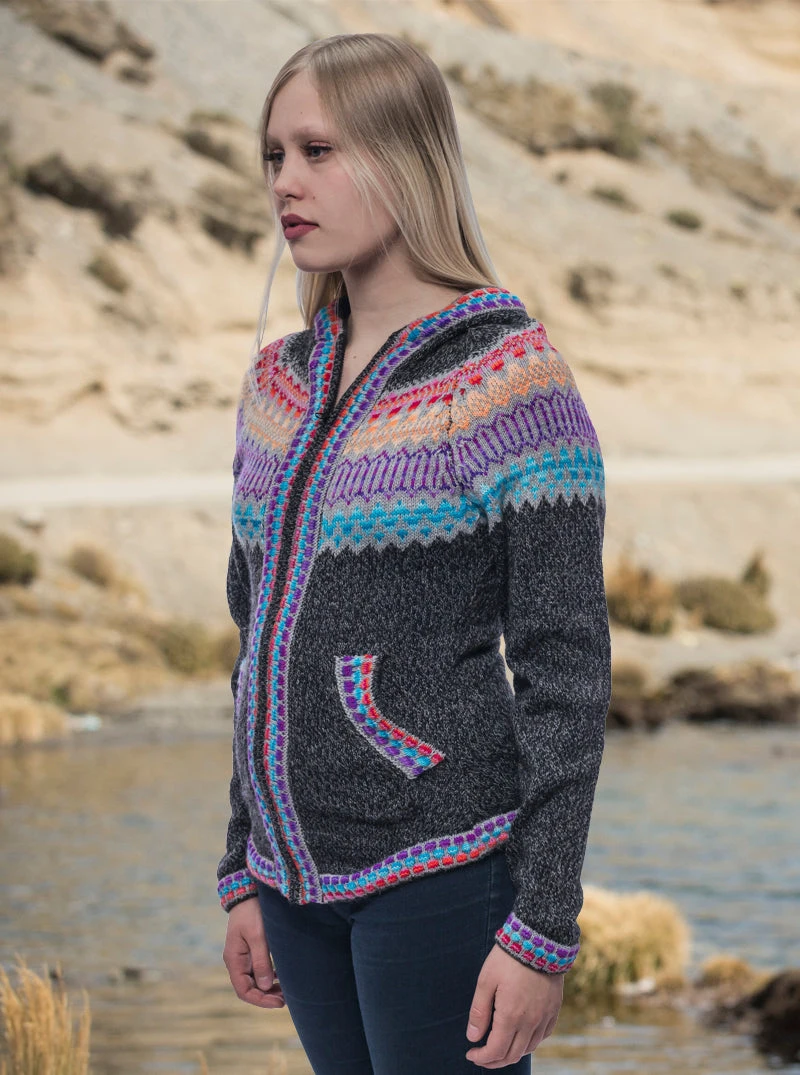 Note: Since this product is is handmade, it may present slight variations from the pictures. Description: Alpaca Cardigan handmade by Bolivian artisians. This model with zipper and hood features front pockets. It has a casual and modern style with geometrical figures on the sides.