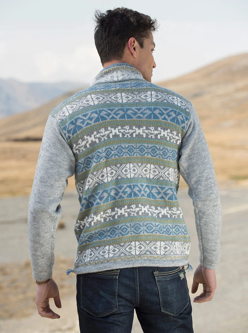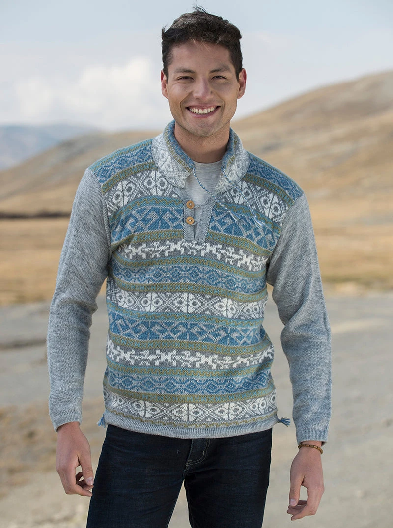 This blue and gray warm alpaca sweater is ideal for a cold day or a meeting with friends..