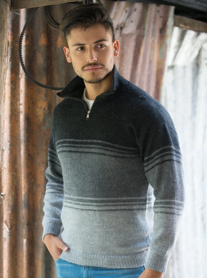 Handmade sweater using Wool Blend. This sweater has a youthful and casual design in gray shades. The zippered neck allows you to wear this cardigan with a turtleneck or shirt style neckÂ